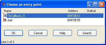 Now you will have a chance to set the breakpoint on the TLS callback function. You need to find it first, though. Ilfak Guilfanov describes a convenient way to do that with IDA Pro in his blog posting. To locate the TLS callback function, load the malicious executable into IDA Pro, then press Ctrl+E to view the executable's entry points. The address of the TLS callback function should be among them.