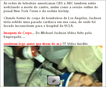 For example, Steve Basford emailed us a link to his blog posting, where he discusses a spammed fake news item invites the victim to download a "video" to download. The message said: "As redes de televisão americanas CBS e ABC também estão noticiando a morte do cantor, assim como a versão online do jornal New York Times e da revista Variety..." (See screen shot below.)