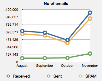 Like all good security people I regularly look at different metrics to see what is going on in the environment. Usually this is a bit of a ho hum task, but every now and then you do come across something interesting. I find it helps to graphically represent the information as abnormalities often jump out at you which otherwise might not be as obvious. Take the graph on the left. This represents the SPAM traffic received in a month. August and September are fairly steady a noticeable drop in October in email received and then, Whoa! What is going on in November? Email messages received increased by more than 100% and the yellow line shows that the majority is SPAM. It is not exactly parallel to the received line so either normal mail increased as well or more SPAM was missed by the tool used to block SPAM. Both are worth investigating further. Metrics, especially visualised metrics, can be very effective in identifying whether you need to jump and fix something or whether it is business as usual. |