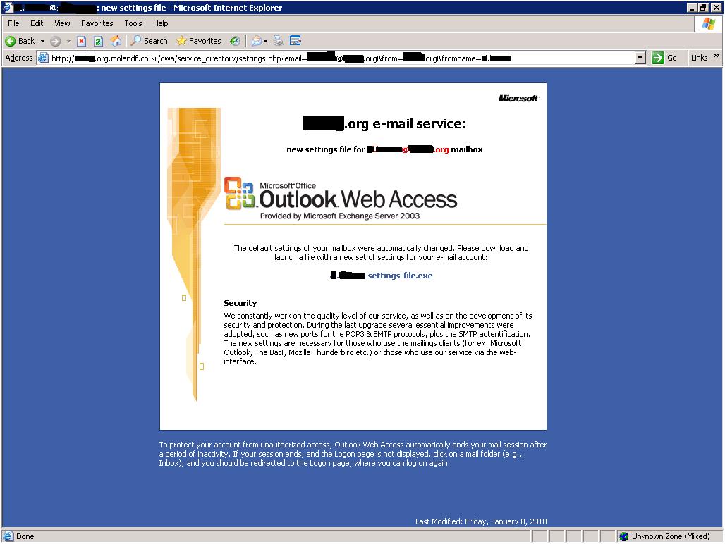 We received a report from Ted of an email campaign targeting OWA users that leads to malware infections, thanks Ted!