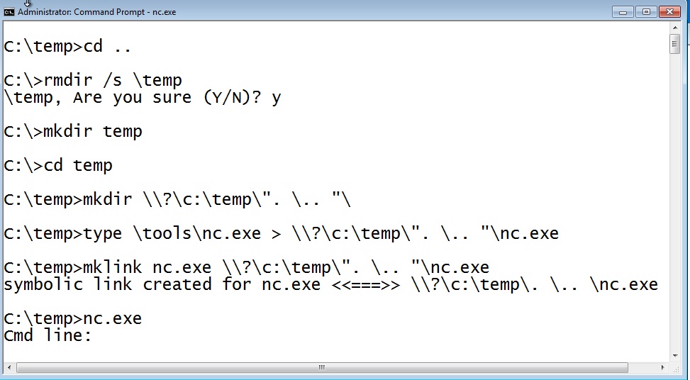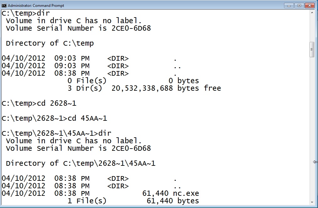 Interesting. Now try this. Open your command prompt and change directories to the path "c:\temp\2628~1\45AA~1\" and do a directory listing. This strange directory name has been consistent in my limited testing. Is it the same for you? There is your copy of nc.exe! What the heck is that?