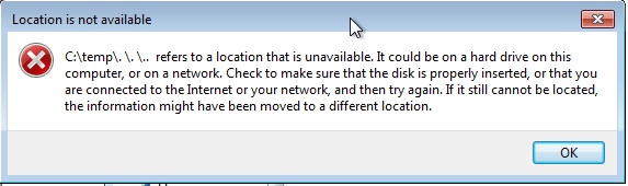 We created a ". " (dot space) directory with a ".. " (dot dot space) subdirectory. Then we put a copy of netcat in it. (Your path to nc.exe may be different from this example). As you see from the image above you can still execute netcat without any problems if you use a symbolic link. Now try and browse to the c:\temp\ directory using the Windows Explorer GUI. You will notice the SHORTCUT to NC.EXE in our c:\temp directory. Double click on the ". " (dot space) directory. You might expect that it take you into a directory containing our ".. " (dot dot space) directory, but it doesn't! Instead we are still in the c:\temp directory with our shortcut to nc.exe! Double click the ". " (dot space) directory again. This time we DO change to the directory containing ".. " (dot dot space). Weird! Now, Double click your ".. " (dot dot space) directory. Where will that take you? It takes you to the following error message: