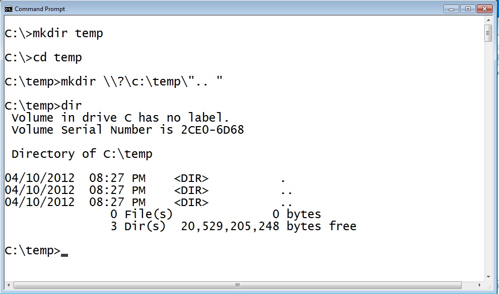 Good day readers! I've been playing around with creating unusual file names for a while. (http://vimeo.com/9484706 , http://pauldotcom.com/2011/12/looking-for-stealth-ads-stream.html) For example, did you know you can create a ".. " (dot dot space) directory on Windows just like you can in Linux? Want to try it? Open up a command prompt and type this: