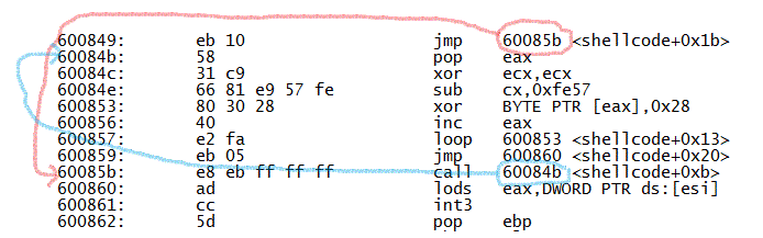 Why would the code JMP to an address only to CALL back to the address that's right behind the original JMP ? Well .. The shell code has no idea where it resides in memory when it runs, and in order to XOR-decode the remainder of the shellcode, it has to determine its current address. A "CALL" is a function call, and pushes a return address onto the CPU stack. Thus, after the "call 60085b" instruction, the stack will contain 600860 as the return address. The instruction at 60084b then "pops" this address from the stack, which means that register EAX now points to 600860 .. and xor [eax], 0x28 / inc eax then cycle over the shellcode, and XOR every byte with 0x28.