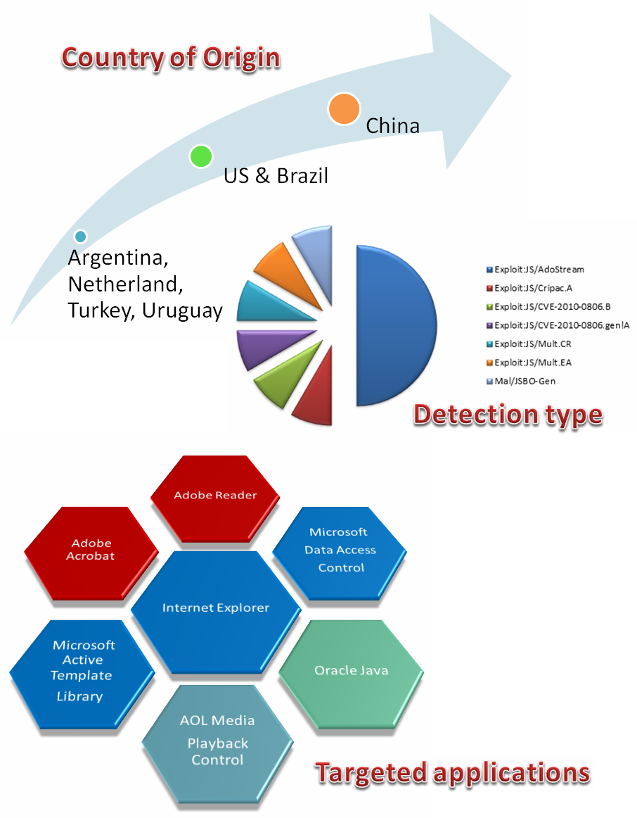 - While the likes of the JS/Mult family indicates malicious JavaScript written to exploit multiple vulnerabilities (Adobe, Java, etc.), almost all these exploits universally favor exploiting Internet Explorer vulnerabilities such as CVE-2010-0249, CVE-2010-0806, and CVE-2009-0075. CVE-2010-0249, aka "HTML Object Memory Corruption Vulnerability" was used during Operation Aurora. If you followed Aurora closely back in the day, you'll likely find the country of origin statistics below of no surprise. CVE-2010-0806 was addressed in MS10-018 and and CVE-2009-0075 was addressed in MS09-002 to correct Internet Explorer issues described as unitialized memory corruption vulnerabilities. For what are vulnerabilities where updates were issued as much as three years ago, clearly enough unpatched systems remain to warrant such common exploitation.