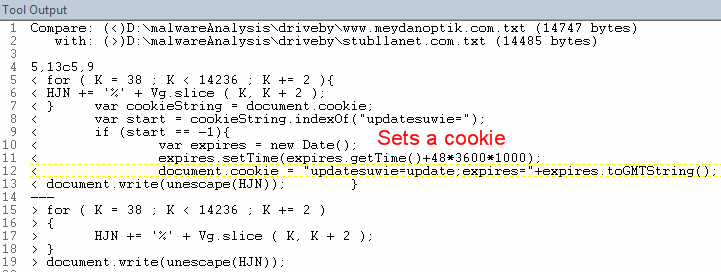 The Exploit:JS/Mult.EA sample was also noted as a slight variant of Exploit:JS/AdoStream. Using the German sample to compare against the slight variant from Turkey showed a 94% match.