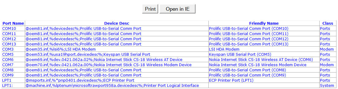 My thought was - there's got to be a way to do this from the command line with WMIC.  WMIC gives you a unique access to the internals of Microsoft Windows, is available for or is native to all modern Windows Platforms, and is usually very simple to figure out.  Not today though, after 20 minutes of effort, one script prints the first COM port, the other catches the physical COM ports but not the USB ones.  So, in the best sysadmin tradition, after 20 minutes, I’ve (temporarily) given up on WMIC for this and decided to try a different approach.