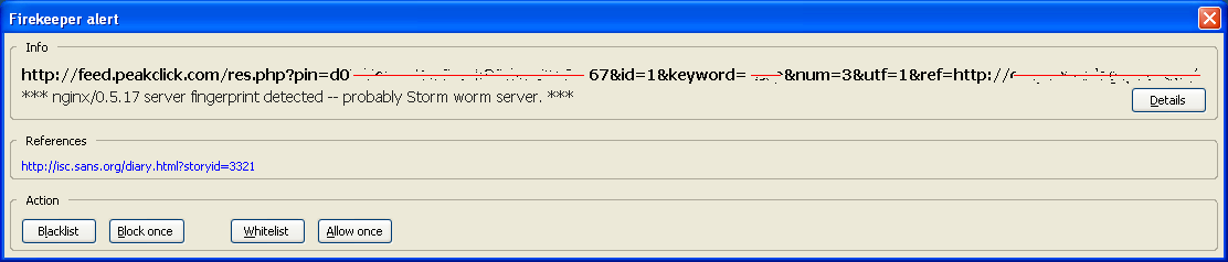 Although the signature is too generic, the idea behind the Firekeeper tool (we mentioned it a year ago) is great, as it provides IDS/IPS capabilities where they are required today, at the browser level, after decompression and decryption (https) have been applied. The tool is based on rules (similar to Snort), although it only implements a small set at this point. Unfortunately, the latest version, 0.2.14 (October 2007), is still in alpha status and somehow not very active.