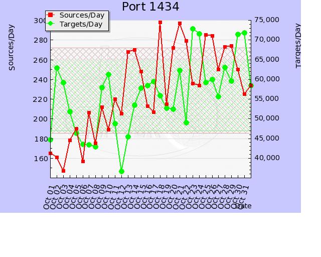If you pull up port 1434 on DShield it looks like the exercise did more damage than good. It started off the month with a low outlier of 165 sources and ended the month with an average or 235. the problem with the DShield data is that TCP and UDP are merged in that particular report. For scoring this exercise I'm relying on my own darknet sensors that monitor a couple of /16 netblocks. It has the advantage that I know that the monitored space and number of sensors hasn't changed in during the course of the exercise and I have full packet captures so that I can create alerts on only Slammer packets and rule out any other UDP/1434 traffic that may be present.