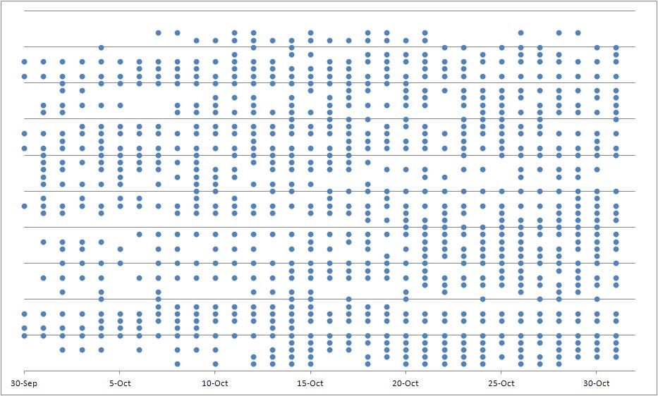 I filtered the results down to all of the IP addresses that visited more than 10 days in October, which gave me 47 systems to plot out over the month. Nearly 13 look to have gone potentially-silent during the month. I base this on the number of systems that don't have a mark present on the last few days of the month. On the other hand there appear to be 2 that were potential new-infections. This sent me off on a focused analysis of just those two systems, the first (in Algeria) appears to be new visitor to my sensor, while the second has been a regular visitor for a long time, typically 4 to 7 visits a month.