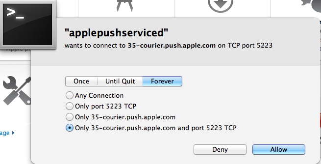 When Lion first appeared in the Apple App store most of probably blindly click YES YES YES like good little Apple zombies (me included!)... After some updates and fiddling with Applications to get them working I started to take a hard look at what was now leaving my devices. A new series of packets on port TCP 5223 was leaving outbound from my network stack and thanks to Little Snitch [1] I was in control of it.