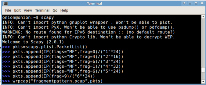 Once you have the full packet capture, how do you find the fragmented attacks?  You could try reassembling them with Wireshark.  Let's check that out and see what happens.  Security Onion has scapy installed so let's use that to generate some overlapping fragments.  I'll generate the classic overlapped fragment pattern illustrated by the paper “Active Mapping: Resisting NIDS Evasion Without Altering Traffic” by Umesh Shankar and Vern Paxson [6] and then further explained in “Target Based Fragmentation Assembly” by Judy Novak [7].