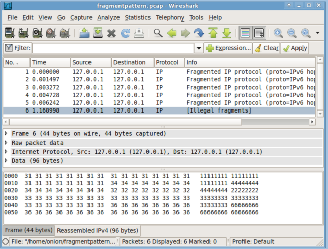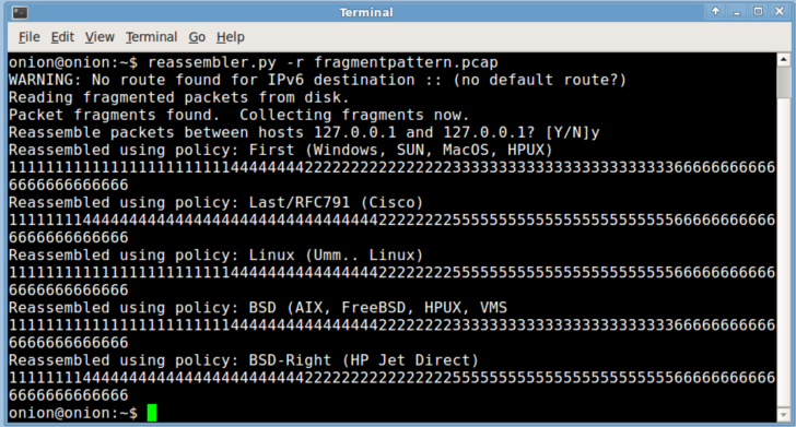 If you compare the reassembled pattern to what was outlined in Judy Novak's paper you will recognize the BSD reassembly pattern.  So you will see all the attack packets that are targeted at a host using the BSD reassembly methodology, but not ones targeted at other reassembly policies (First, Last, BSD-Right and Linux).   You would not see overlapping fragmentation attacks targeted at both Windows and Linux.  However, Security Onion now (as of build 20120518 [8] ) has a Python script called "reassembler.py". If you provide reassembler.py with a pcap that contains fragments, it will reassemble the packets using each of the 5 reassembly engines and show you the result.  It will even write the 5 versions of the packets to disk so you can examine binary payloads as the target OS would see them.  Let's see what reassembler does with the fragmented packets we just created.