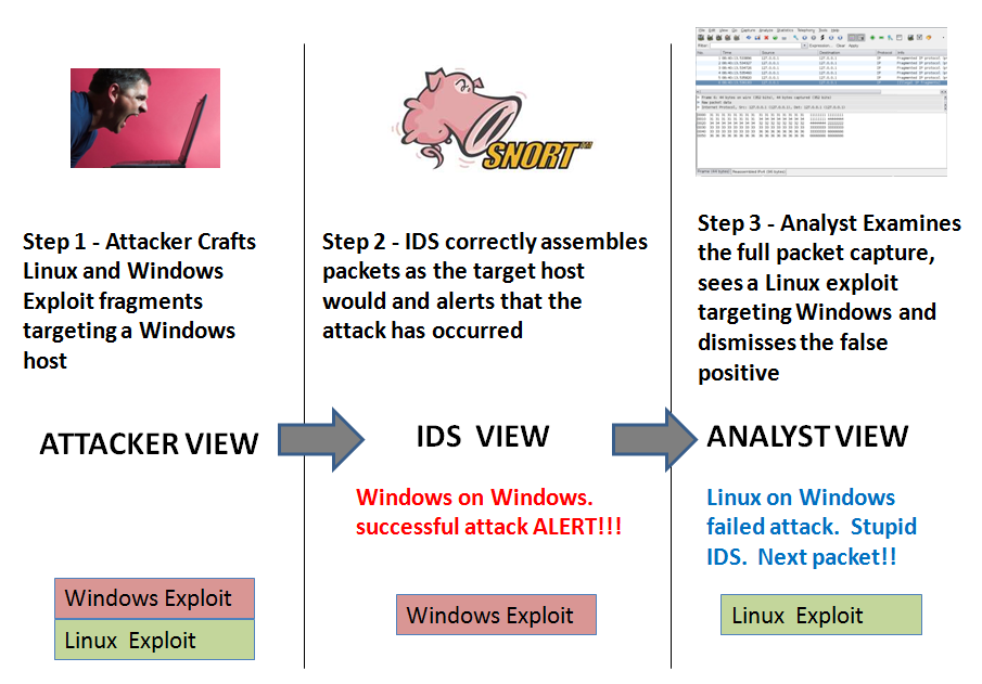 Using overlapping IP fragmentation to avoid detection by an IDS has been around for a long time.  We know how to solve this problem.  The best option in my opinion is to use a tool such as OpenBSD's pf packet filter [1] to scrub our packets eliminating all the fragments (pfSense [2] makes this easy to deploy).  However, this option is not without its caveats [3].  You could simply configure your IDS to alert for and/or drop any overlapping fragmented packets.   Overlapping fragments should not exist in normal traffic.   Another option is to configure the IDS to reassemble the packets the same way the endpoint reassembles them.  Snort's frag3 preprocessor will reassemble the packets based on the OS of the target IP and successfully detect any fragmented attacks that would work against a given target host.  Problem solved right?  There is another opportunity for attackers to use differences in the fragmentation reassembly engines to his advantage.  What happens when the IDS analyst turns to their full packet capture to understand the attack?  If the analyst's tools reassemble the packets differently than the target OS the analyst may incorrectly dismiss the TRUE positive as a FALSE positive.