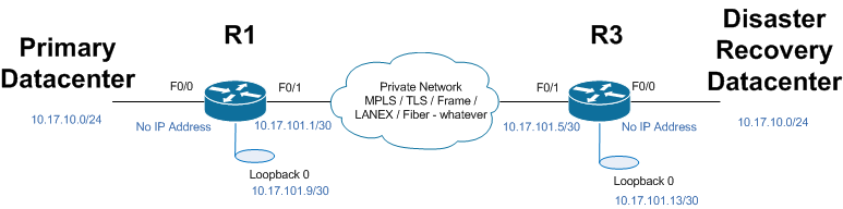 You can see that the primary and DR Datacenters have the same ip subnet (10.17.10.0/24), but are separated by some arbitrary WAN network