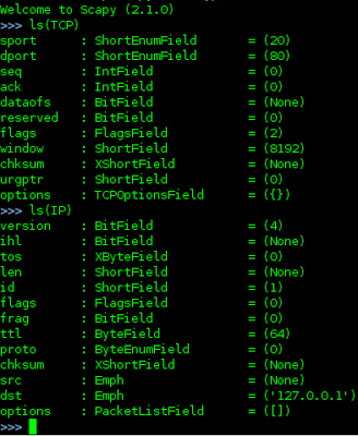 Scapy is ridiculously powerful and is given no justice here, hopefully just enough information to entice you to explore further. With just the principles established here, you can see the likes of options to craft and manipulate with ls(TCP) and ls(IP).