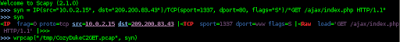 To quickly craft a PCAP to trigger this rule, at a bash prompt, I ran scapy, followed by syn = IP(src="10.0.2.15", dst="209.200.83.43")/TCP(sport=1337, dport=80, flags="S")/"GET /ajax/index.php HTTP/1.1", then wrote the results out with wrpcap("/tmp/CozyDukeC2GET.pcap", syn), as seen in Figure 2.